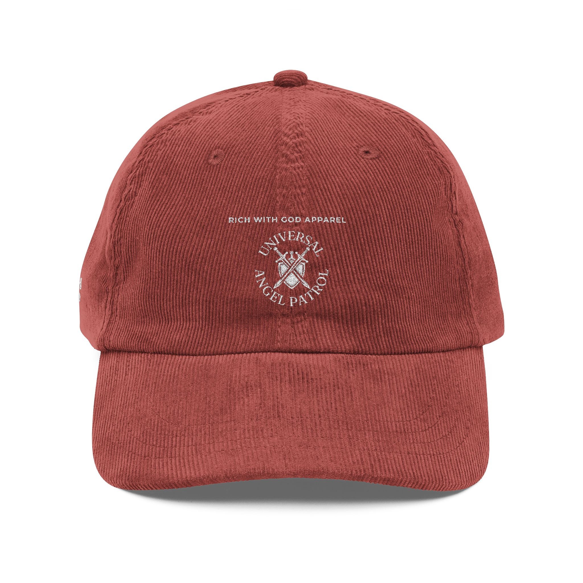 Elevate your faith-inspired style with the Universal Angel Patrol Embroidered Vintage Corduroy Cap, a signature piece from the Rich With God Apparel Collection. Crafted from soft-ribbed corduroy in a rich vintage rust tone, this cap blends timeless style with subtle affirmation. The curved brim and embroidered front text “Universal Angel Patrol” serve as a daily reminder of divine guidance, protection, and purpose, keeping your faith close no matter where life takes you.