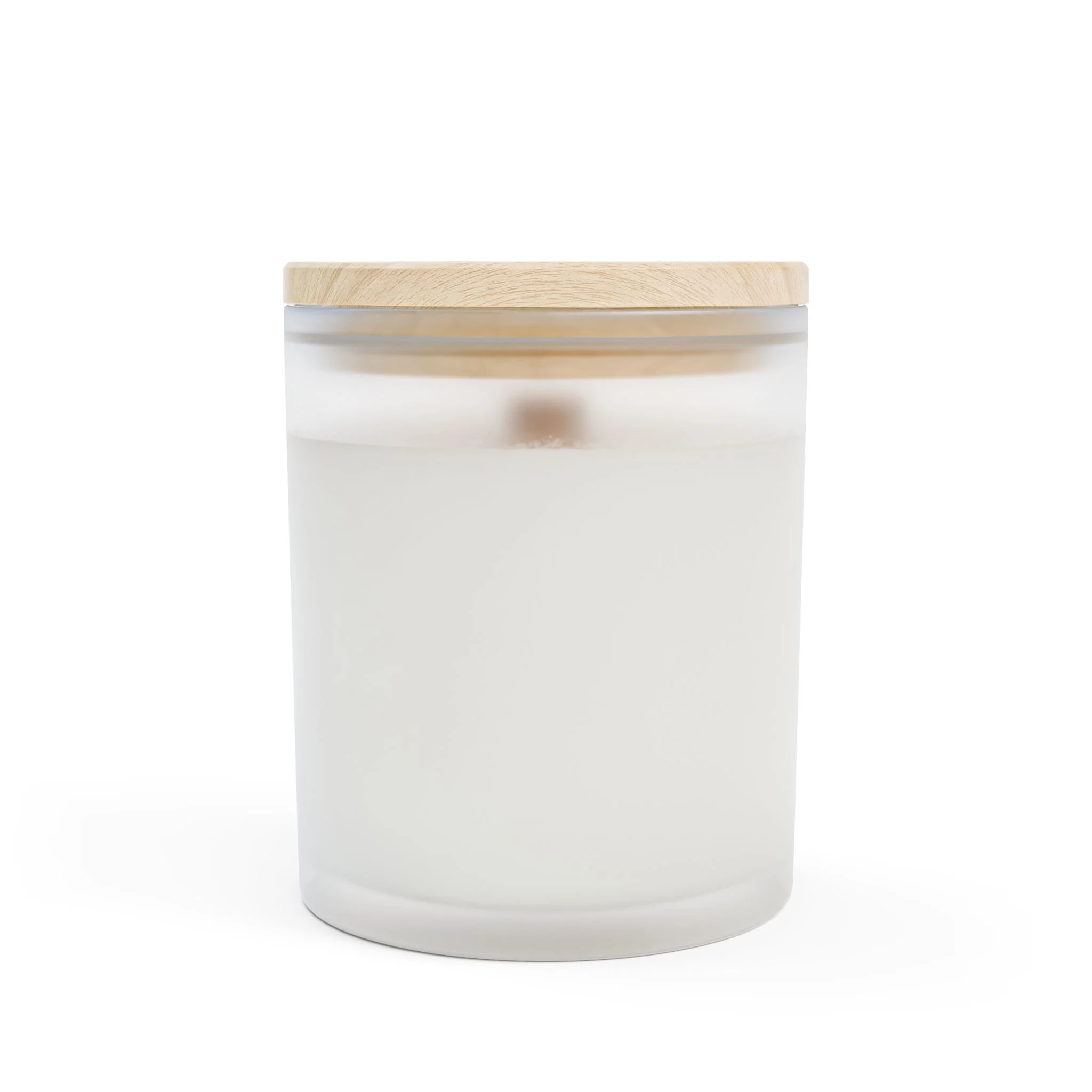 - Frosted glass vessel with raw maple lid — 11oz vessel / 9oz wax