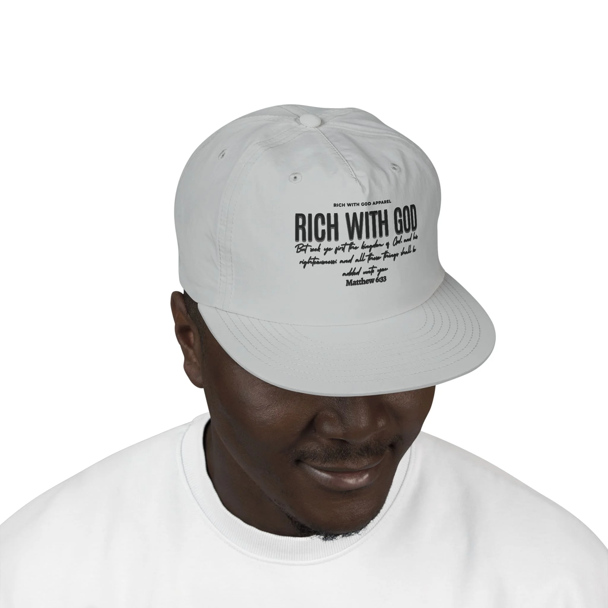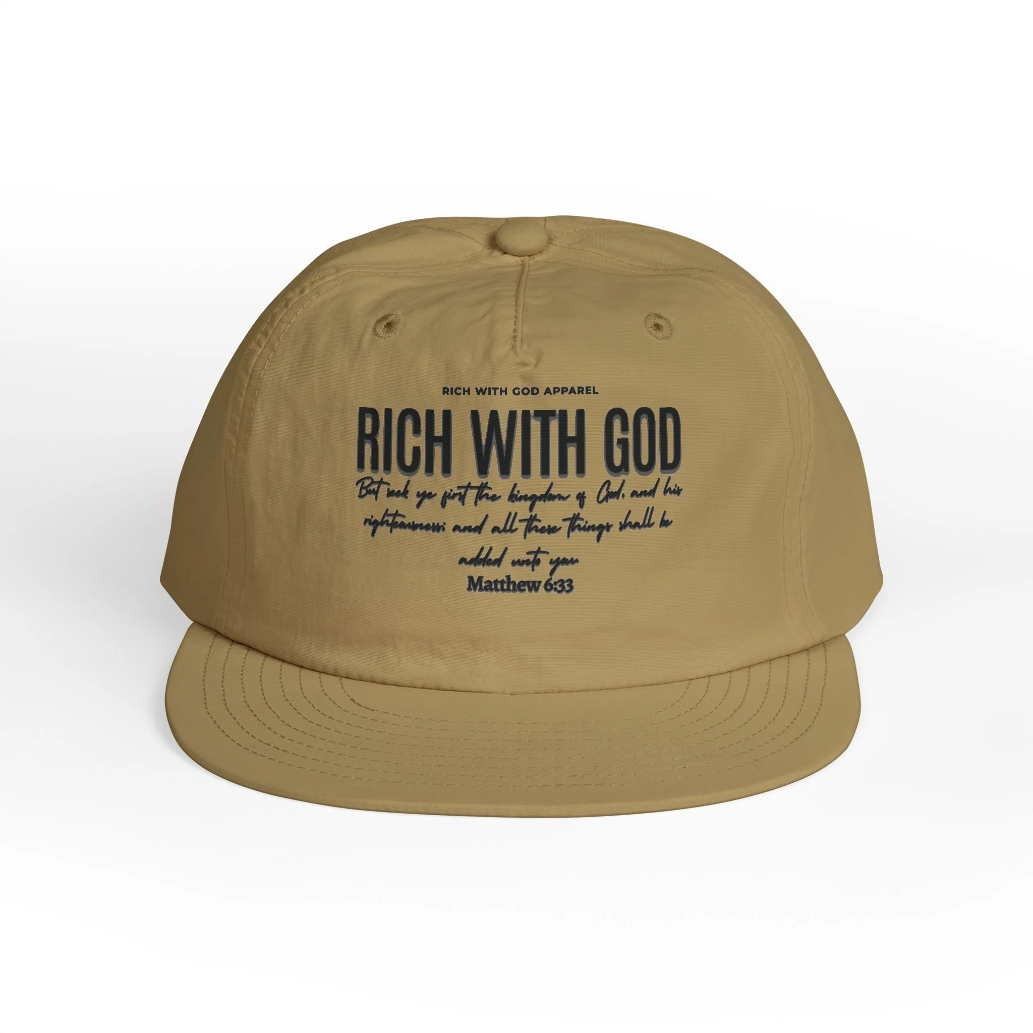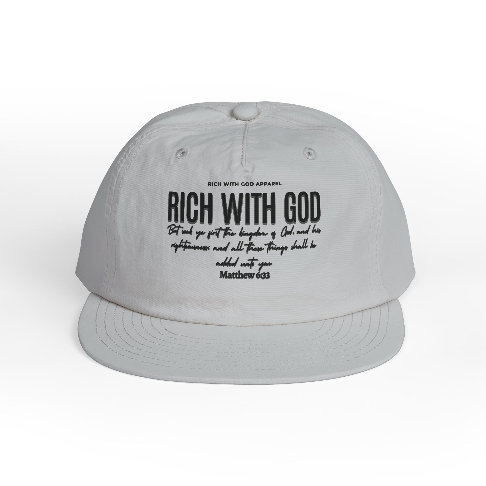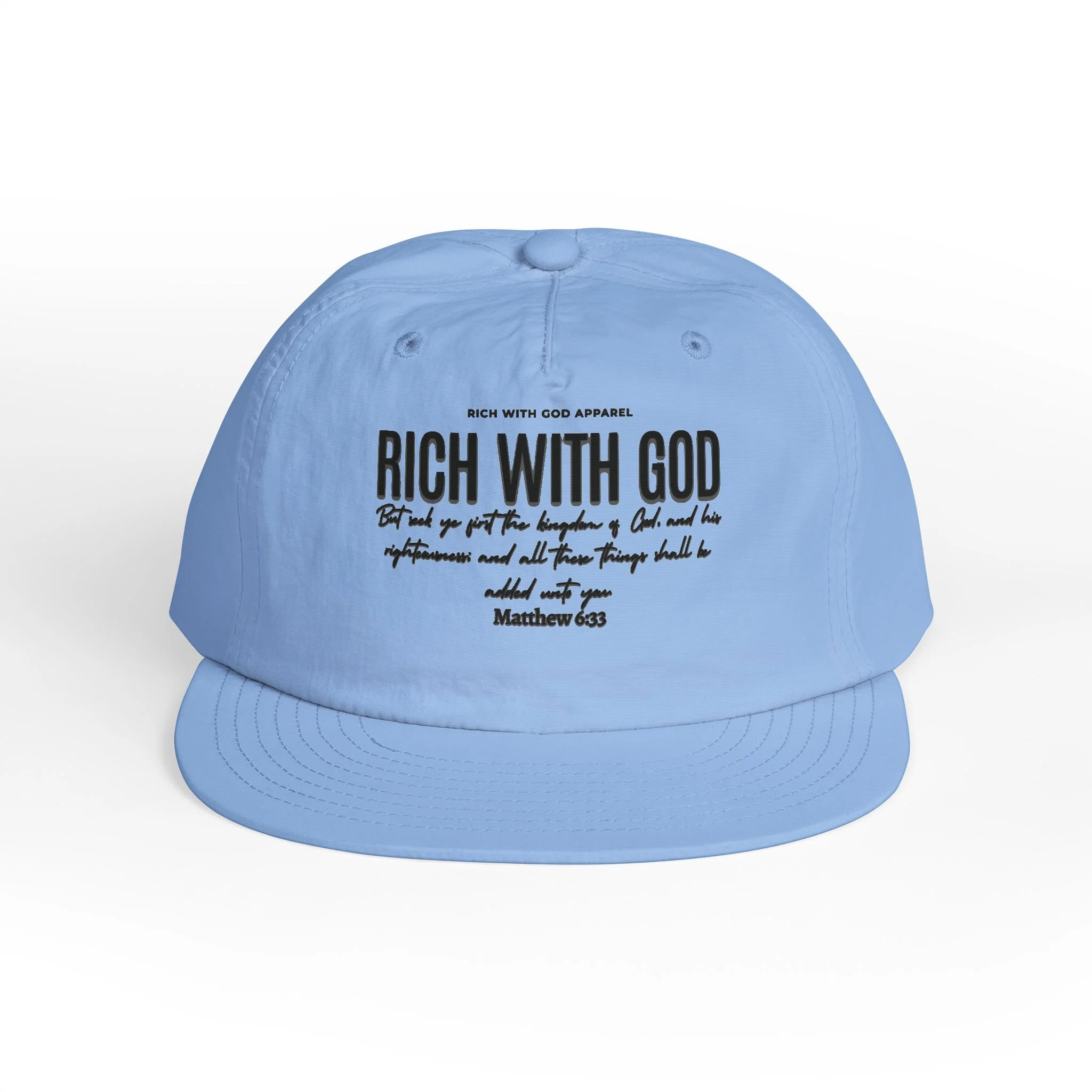 Seek Him first — and let your style speak that truth. The Rich With God Matthew 6:33 Surf Cap Snapback features Matthew 6:33 boldly embroidered on the front, serving as a daily reminder to prioritize God’s kingdom and trust that everything else will be added in divine timing. Whether worn during morning devotion walks, beach days, workouts, or everyday errands, this cap keeps your spirit centered and your look effortlessly clean.