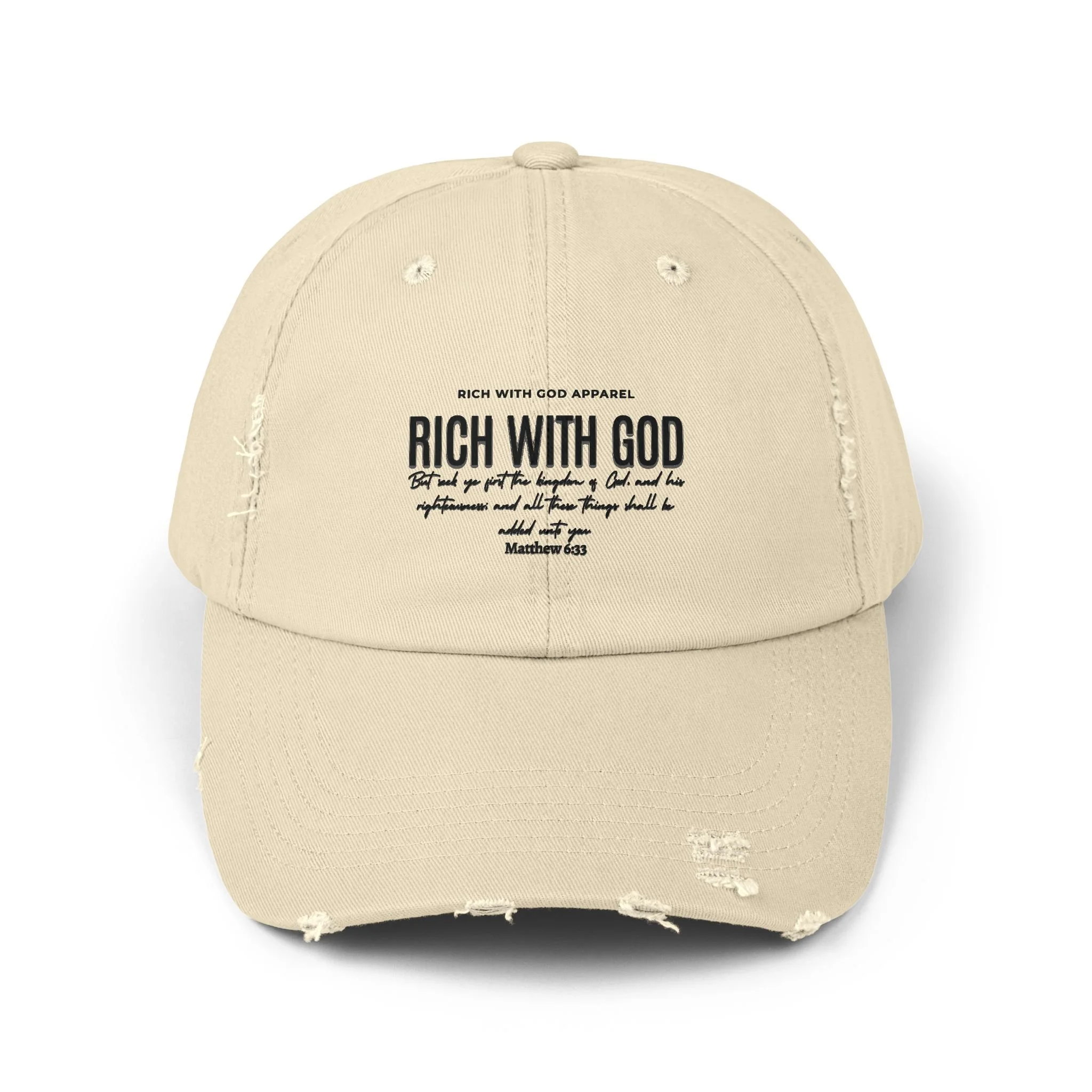 Introducing the Rich With God Matthew 6:33 Unisex Distressed Cap, a faith-forward accessory from the Rich With God Apparel Collection that inspires purpose, focus, and spiritual alignment. Featuring the timeless reminder to “Seek first the kingdom of God,” this cap encourages you to live intentionally and trust in divine provision every day.